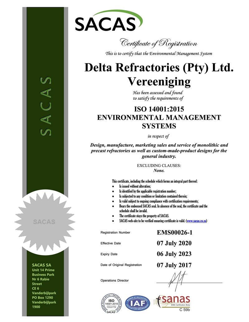 Delta Refractories (Pty) Ltd is ISO accreditted for: